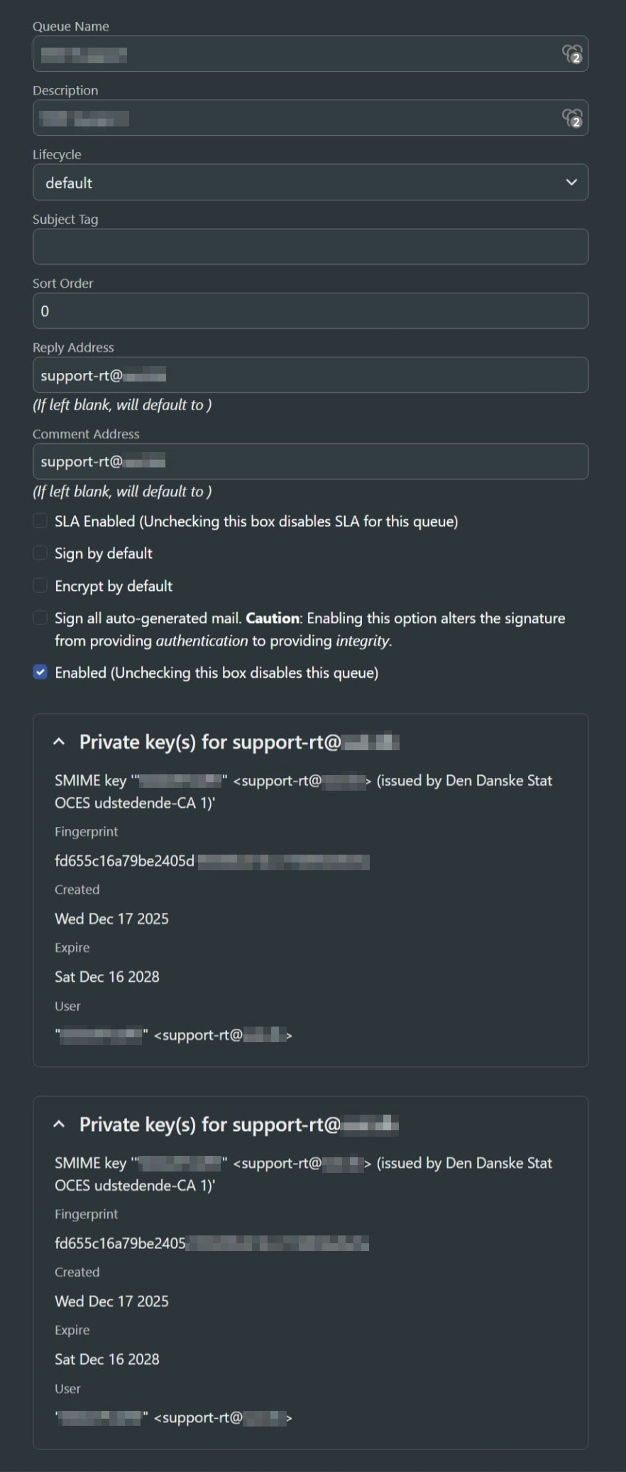 Ok I noticed in the logs that there is an error: [1598886] [Mon Mar 30 11:31:40 2026] [debug]: openssl stderr: Could not read signing key from /opt/rt6/var/data/smime/support-rt@mydomain.com.pem 40C74834737F0000:error:1608010C:STORE routines:ossl_store_handle_load_result:unsupported:../crypto/store/store_result.c:151: 40C74834737F0000:error:1C800064:Provider routines:ossl_cipher_unpadblock:bad decrypt:../providers/implementations/ciphers/ciphercommon_block.c:124: 40C74834737F0000:error:11800074:PKCS12 routines:PKCS12_pbe_crypt_ex:pkcs12 cipherfinal error:../crypto/pkcs12/p12_decr.c:86:maybe wrong password (/opt/rt6/sbin/../lib/RT/Crypt/SMIME.pm:451)