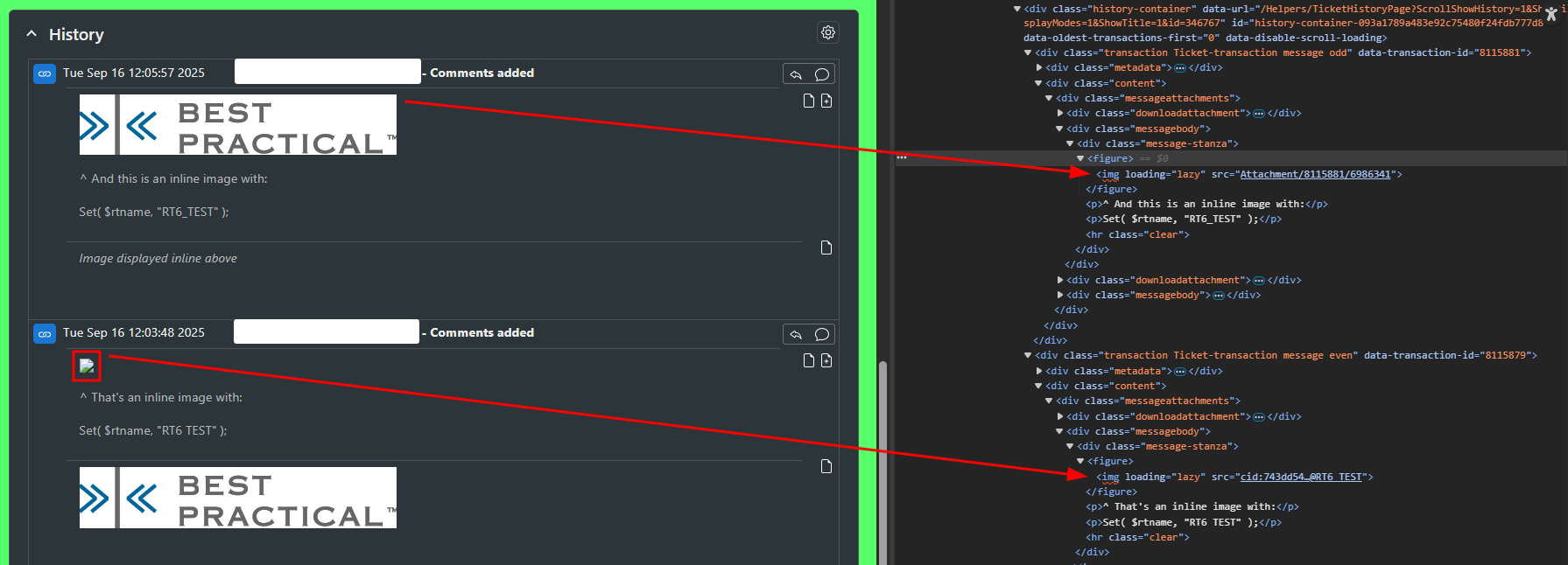 In the above screenshot, the lower comment includes an inline image which was created when rtname was “RT6 TEST”, containing a space, and results in a broken image link being inserted. The upper comment was made after changing rtname to “RT6_TEST” and restarting the server, and results in the image being inserted as expected.