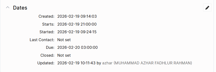In “history” tab there is all information about the creation date or if someone is changing the value of any field in the ticket.